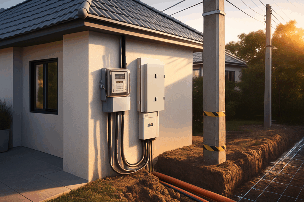 เดินสายไฟฟ้าเข้าบ้าน/เข้าที่ดิน: มาตรฐาน–วัสดุ–งบประมาณ